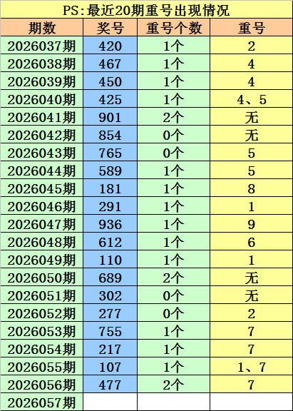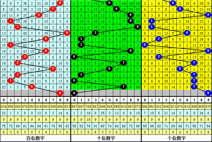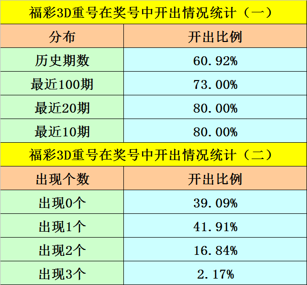 最近100期开奖中,含有重号的奖号有73期,最近20期含有重号的奖号有16期,最近10期含有重号的奖号有8期。本期排斥重号。